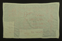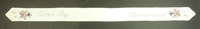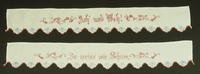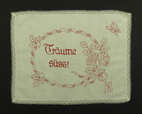 Spruchband, zweiteilig Zwei-teiliges rot besticktes Spruchband. Der untere Rand ist gerundet und mit Schlingstich eingefasst. In den Rundungen befindet sich jeweils ein Blumenmuster. Auf beiden Bändern befindet sich jeweils ein Teil des zusammengehörenden Spruches, der links und rechts von floralen Verziehrungen eingefasst wird: "Auf duftigen Linnen, / verträumt sich so manches" -