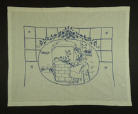 Wandschoner Blau bestickter Wandschoner. Die Motive sind mit Kreuzstich und Stielstich gearbeitet. Dargestellt ist Aschenputtel vor dem Herd sitzend und den Vögeln Körner gebend. Die gesamte Szene ist mit Verzierungen umrahmt. -