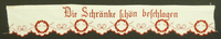 Spruchband Maschinebesticktes Spruchband für ein Schrankregal. Die Verziehrungen und der Spruch sind mit rotem Faden gestickt. Der untere Rand ist gerundet und eingefasst. In den Rundungen befinden sich Kränze und Schleifenmuster. Der Spruch darüber lautet: "Die Schränke schön beschlagen". -