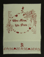 Überhandtuch Rot besticktes Überhandtuch, das oben und unten mit einem Holsaum verziert ist. Die Motive sind mit Stiel- und Plattstich gestickt. Dargestellt sind Blumenranken, das Monogramm SK und der Spruch: "Ohne Fleiss, / kein Preis". -