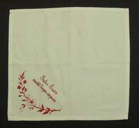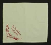 Serviette Rot bestickte Serviette. In der linken, unteren Ecke ist eine Blumengirlande, deren Blumen mit weißem und rotem Garn gefüllt sind und der Spruch: "Unser täglich Brod / gib uns Heute." -