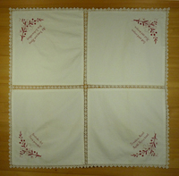 Serviette Rot bestickte Serviette. In der linken, unteren Ecke ist eine Blumengirlande, deren Blumen mit weißem und rotem Garn gefüllt sind und der Spruch: "Ein froher Gast / ist niemand Last." -