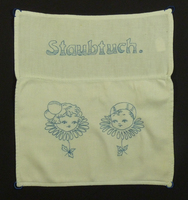Wandbehang Blau bestickter Beutel für Staubtücher. In den Ecken sind gehäkelte Laschen um den Beutel aufzuhängen. In der oberen Hälfte steht "Staubtuch" und die untere Hälfte wird von zwei Kindergesichtern, die aus Blumen erwachsen, verziert. -