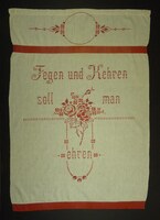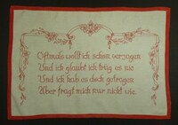 Wandschoner Rot bestickt; mit rotem Schrängband eingefasst; Blumenranken; Spruch: "Oftmals wollt ich schon verzagen / Und glaubt ich trüg es nie / Und ich hab es doch getragen / Aber fragt mich nur nicht wie /" -