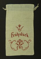 Brotsack Motiv: Blumen; mit Rot bestickt; Sacköffnung mit blauem Futter; Spruch: "Frühstück" -