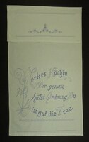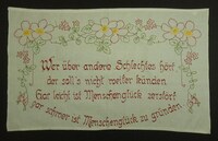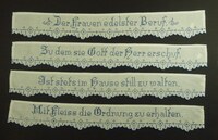 Spruchband, 4-teilig Unterer Rand girlandenförmig; Blau bestickt; Kreuzstich; Spruch: "Der Frauen edelster Beruf / Zu dem sie Gott der Herr erschuf / Ist stets im Hause still zu walten / Mit Fleiss die Ordnung stets zu erhalten."
