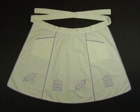 Schürze Weiße Schürze mit zwei Bändern und zwei Taschen vorne; in 2 Violett-Tönen bestickt; Stielstich; Motiv: Nudelwalker mit Schneebesen, beschriftete Mehldose; lila eingesäumt -