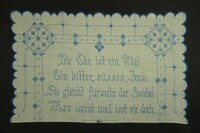 Spruchband, 4-teilig Blau bestickt; Kreuzstich; unterer Rand mit Schlingstich eingefasst; Spruch: "Was Mütterlein mir einst beschert, / Halt' ich in diesem Schranke wert, / Soll glatt und fein geordnet sein, / Wie's einstens hielt mein Mütterlein." -
