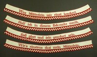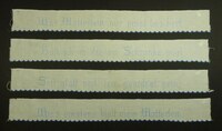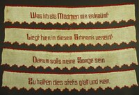 Spruchband, 4-teilig Rot bestickt; Kettenstich; untere Hälfte 2 feine Hohlsäume über die gesamte Länge; unten rund eingefasst mit Schlingstich; Spruch: "Ehret die Frauen / Sie flechten und weben / Himmlische Rosen / Ins irdische Leben" -