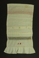 Spruchband, 4-teilig Kreuzstich; Rot bestickt; oberer Rand eingehäkelt, unterer Rand mit Schlingstich; Spruch: "Liegt hier in diesem Schrank vereint / Was ich als Mädchen mir erträumt / Darum solls meine Sorge sein / Zu halten dies stets glatt und rein." -