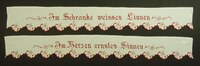 Spruchband, 2-teilig Rot bestickt; Plattstich; unterer Rand mit Kleeblättern mit Schlingstich eingefasst; Spruch: "Im Schranke weisses Linnen / Im Herzen ernstes Sinnen" -