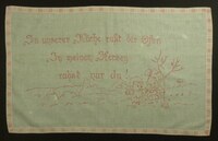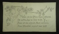 Spruchtuch Grau bestickt; Stielstich; mit Hohlsaum; in den Ecken eingefasste Löcher zum Aufhängen; Motiv: Blumenranken und Engel; Spruch: "Wenn sich der Eltern Augen schliessen, / Ihr mattes Aug’ im Tode bricht; / Dann ist das schönste Band zerrrissen, / Denn Elternlieb vergisst man nicht." -
