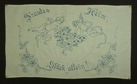Wandschoner Platt- und Stielstich; Hell- und Dunkelblau bestickt; Motiv: zwei Engel mit Blumenbouquet; Spruch: "Trautes Heim, / Glück allein!" -