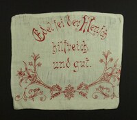 Kissenbezug Blumenornamente; Rot bestickt; Spruch: "Edel sei der Mensch / hilfreich / und gut!" -