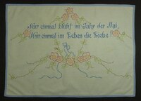 Wandschoner Spruch mit blauem Faden gestickt; Blumenmuster in Grün, Blau, Rot; Spruch: "Nur einmal blüht im Jahr der Mai, / Nnr einmal im Leben die Liebe!" -