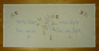 Spruchtuch, religiös In Hellblau bestickt; Plattstich, Perlstich; unterlegt; Blumenmotive in Rosa, Hellblau, Grün, Rot, Beige, Gelb und Türkis; links, rechts und oben mit Hohlsaum, an der rechten Ecke oben ein Plastikring; Spruch: "Gottes Engel halten Wacht, / Über uns bei Tag und Nacht" -