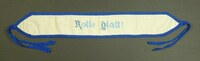 Spruchband Blau bestickt; Plattstich; mit blauem Textilband eingefasst; an den Enden jeweils zwei Bänder zum Binden; Spruch: "Rolle glatt!" -