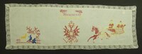 Decke Kreuzstich; eingefasst mit Spitze; Motiv: Doppeladler, Kutsche mit Weihnachtsmann; Spruch: "Souvenir" -