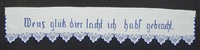 Spruchband, 3-teilig Vermutlich ohne Vorlage; in Blau bestickt; Plattstich; unterer Rand mit verschiedenen Blumenmotiven; mit Schlingstich eingefasst; Spruch: "Übe vorsicht eile nicht. / den geschir gar leicht verbricht. / Wens glük dier lacht ich habs gebracht." -