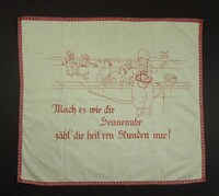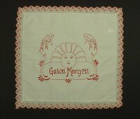 Deckchen für Nachttisch mit rotem Faden bestickt; mit Spitzen eingefasst; Sonne und Vögel Spruch: "Guten Morgen." -
