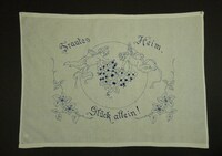 Wandbehang blau bestickt mit Nähmaschine; Blumenranken sowie zwei fliegende Engel, die um ein zentrales Blumenarrangement positioniert sind; Spruch: "Trautes Heim, / Glück allein!" -