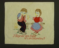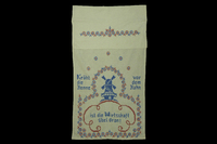 Handtuch Kreuzstich; blau, rot bestickt; Hollandmotiv: Windmühle, Blumen; Spruch: "Kräht die Henne / vor dem Hahn / ist die Wirtschaft / übel dran!" -
