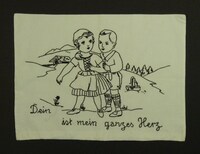 Kissenbezug schwarz bestickt; Pärchen vor einer Landschaft; Spruch: "Dein / ist mein ganzes Herz" -
