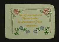 Kissenbezug gelb, rot, grün, blau, braun bestickt; Stielstich; Blumenornament; Spruch: "Glück, Fröhlichkeit und / Herzensfrieden / sei allzeit diesem Haus / beschieden." -