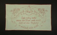 Spruchtuch rot bestickt; Segelschiffe, Rosenbouquet; Tuch mit rotem Garn umhäkelt; Spruch: "Segle ruhig weiter / wenn der Mast auch bricht, / Gott ist dein Begleiter / er verlässt dich nicht." -