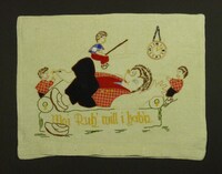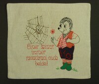 Kissenbezug Mecki Vater, ein paar Kinder turnen auf ihm herum, er schläft; Spruch: "Mei Ruh' will i hab'n" -