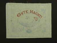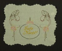 Deckchen für Nachttisch mit schwarzem Kettenstich eingefasst; Vögel und Blumen; Spruch: "Gute / Nacht!" -