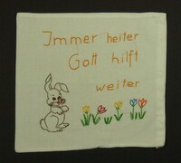Kissenbezug orange, braun, gelb, blau, grün bestickt; Stielstich; ohne Vordruck; Hase und Blumen; Spruch: "Immer heiter / Gott hilft / weiter" -