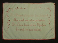 Spruchtuch rot und rosa bestickt; zarte Blumengirlande; Rechtschreibkorrektur mit Filzstift (Frau); Einfassung mit rot-weißem Band; Spruch: "Die Wirtschaft gleicht dem Automobil / Man muß verstehn zu lenken / Die Frau darin ist der Chaufeur / Sie muß an alles denken" -