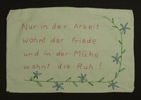 Kissenbezug Stielstich; ohne Vordruck; Spruch rosa gestickt; Blumengirlande in blau, gelb und grün; Spruch: "Nur in der Arbeit / wohnt der Friede / und in der Mühe / wohnt die Ruh!"