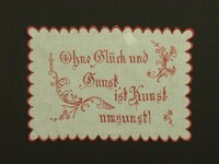 Zierdeckchen Rand bogenförmig; rot bestickt; Spruch: "Ohne Glück und / Gunst, / ist Kunst / umsunst!" -