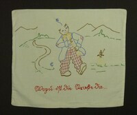 Deckchen für Nachttisch bunt bestickt; unfertig; Zwerg, der sich mit Wasser aus einem Pilz wäscht; Nadel steckt noch im "O"; Spruch: "GUTEN MORGEN!" -