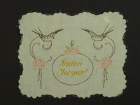 Deckchen für Nachttisch mit schwarzem Kettenstich eingefasst; Vögel und Blumen; Spruch: "Guten / Morgen!" -