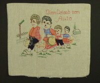 Kissenbezug bunt bestickt mit Straßenmusikant; Spruch: "Wozu ist die Straßn da." (in Sütterlin oder Kurrent geschrieben) -