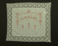 Deckchen für Nachttisch rot bestickt; mit Spitzen eingefasst; Girlande und Blumen; Spruch: "Gute Nacht!" -