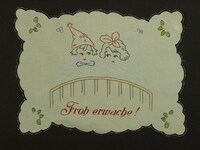 Deckchen für Nachttisch bunt bestickt; zwei Kinder mit offenen Augen im Bett, Junge mit Zipfelmütze, Mädchen mit Schleife auf dem Kopf; Spruch: "Froh erwache! " -