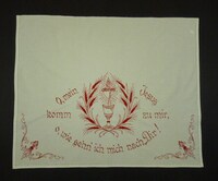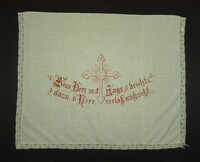 Wandbehang Versehtuch; rot bestickt; Hohlsaum; Kelch, Herz Jesu, Ähren; Spruch: "O, mein Jesus / komm zu mir, / o wie sehn' ich mich nach Dir!" -