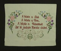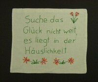 Kissenbezug grün, rot, lila bestickt; ohne Vordruck; Blumen; Spruch: "Suche das / Glück nicht weit, / es liegt in der / Häuslichkeit" -