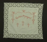 Deckchen für Nachttisch rot bestickt, mit Spitzen eingefasst; Girlande und Blumen; Spruch: "Guten Morgen!" -