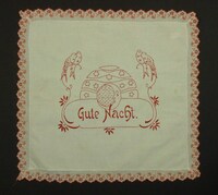 Deckchen für Nachttisch rot bestickt; Kreuzstich; nicht eingefasst; Spruch: "Gute Nacht!" -