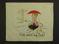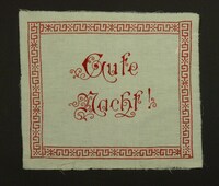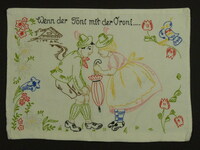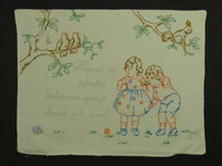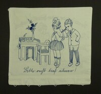 Kissenbezug blau bestickt; Rückseite und Vorderseite unterschiedlich; Vorderseite: Junge untersucht Mädchen, sie stehen vor einem Schreibtisch und Stuhl; Spruch: "Bitte recht tief atmen!" (in Kurrent oder Sütterlin geschrieben); Rückseite: Mädchen und Junge mit einem kl. Leiterwagen; Spruch: "Wie wär's mit einer schönen, kleinen Überlandpartie, / Aber gehn's / Herr Franz, / Aber schaun's / Fräul'n Marie" -