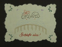 Deckchen für Nachttisch bunt bestickt; mit Kettenstich eingefasst; zwei Kinder im Bett; Spruch: "Schlafe süss!" -