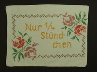 Kissenbezug in gelb, rosa, rot, grün und braun bestickt; Kreuzstich; mit Rosenmotiv; Spruch: "Nur 1/4 / Stünd- / chen" -