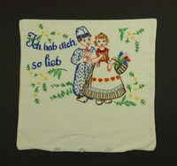 Kissenbezug bunt bestickt; Stielstich; Holländermotiv: Pärchen mit Blumen; Spruch: "Ich hab dich / so lieb" -
