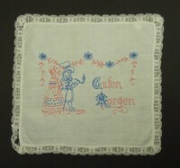 Deckchen für Nachttisch rot und blau bestickt; Stielstich; mit Spitze eingefasst; Frau und Mann beim Spazieren; Spruch: "Guten / Morgen" -