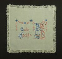 Deckchen für Nachttisch rot und blau bestickt; Stielstich; mit Spitzen eingefasst; Frau und Mann, Kerze; Spruch: "Gute / Nacht" -